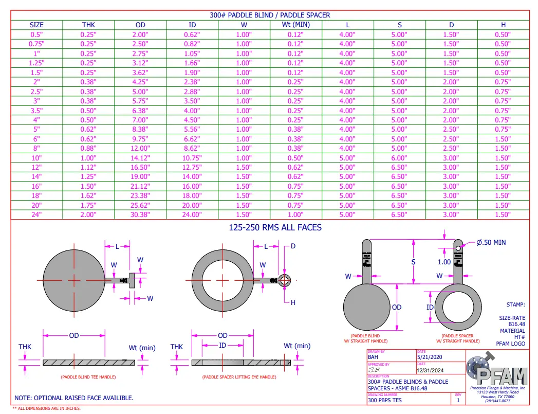 A paddle blind is like the solid end of a figure-8 blank. It has a plain radial handle capable of lifting the part in any orientation. It is generally used with a paddle spacer and sold as a set. Paddle blinds are manufactured to meet ASME B16.48 or customer specified requirements.